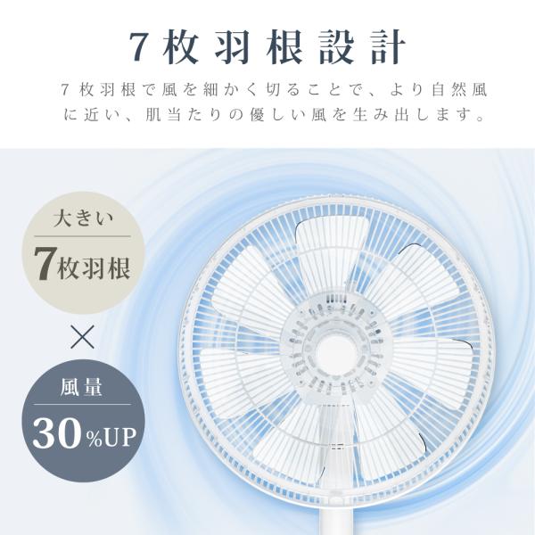 【パワフル送風】7枚根で風を細かく切ることで、より自然風に近い、肌当たりの優しい風を生み出します。大きな羽根で快適送風どこでも風を送れるリビング扇風機。従来品の扇風機より、風量が30%以上アップしています。従来比約1.5倍のワイド設計強い直進性と広い送風面積を実現!