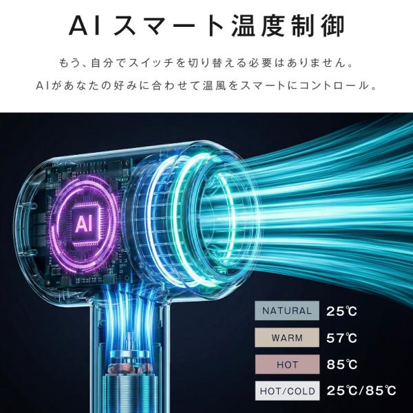 【温冷調節】ワンタッチで強?中?弱、3段階の風量切り替えができて、季節や髪質に合わせて、適正な温?冷風モードで整えます。約57℃の温風モードなら夏場のお風呂あがりも暑くなりすぎずに、快適にご使用いただけます。