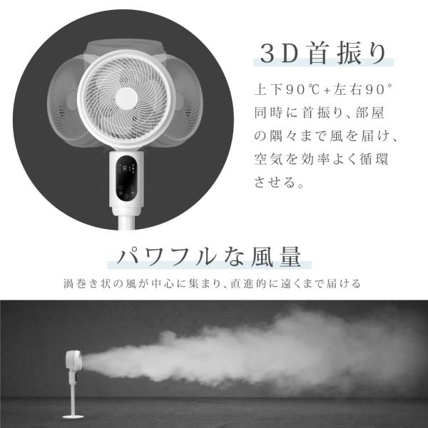 【3D首振り】上下90°C+左右90°同時に首振り、部屋の隅々まで風を届け、空気を効率よく循環させる。