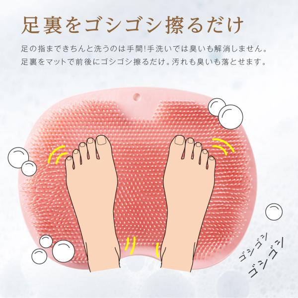 【足裏をゴシゴシ擦るだけ】足の指まできちんと洗うのは手間!手洗いでは臭いも解消しません。足裏をマットで前後にゴシゴシ擦るだけ。汚れも臭いも落とせます。ゴシゴシ洗いは足裏マッサージにつながり、血行が促進されて身体がポカポカと温かくなります。