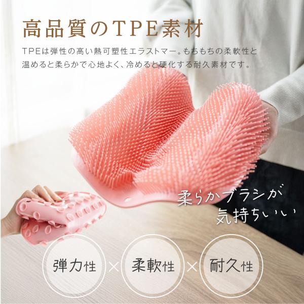 【高品質のTPE素材】TPEは弾性の高い熱可塑性エラストマー。もちもちの柔軟性と温めると柔らかで心地よく、冷めると硬化する耐久素材です。使用中の柔らかいブラシは肌を傷つけず、手洗いとは別格のやみつき新感覚。マッサージのような気持ちよさが魅力です。