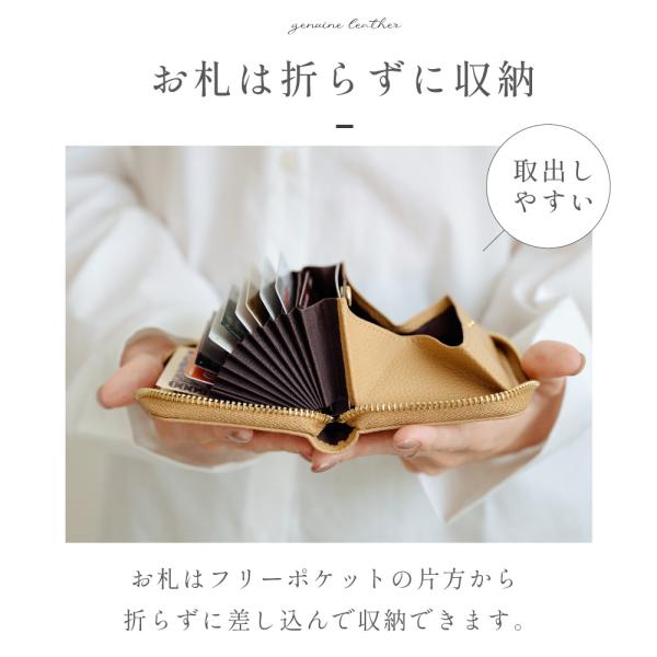 【お札は折らずに収納】お札はフリーポケットの片方から折らずに差し込んで収納できます。底面に浮かしがあるため、お札は複数枚が余裕で入り、小銭入れ裏側にすっきり収まります。