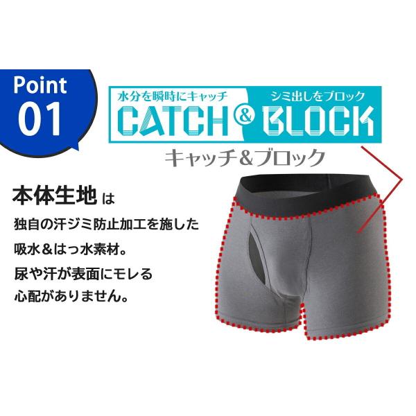 ・独自のキャッチ&ブロック(汗ジミ防止)加工で尿や汗の染みだしを防止
