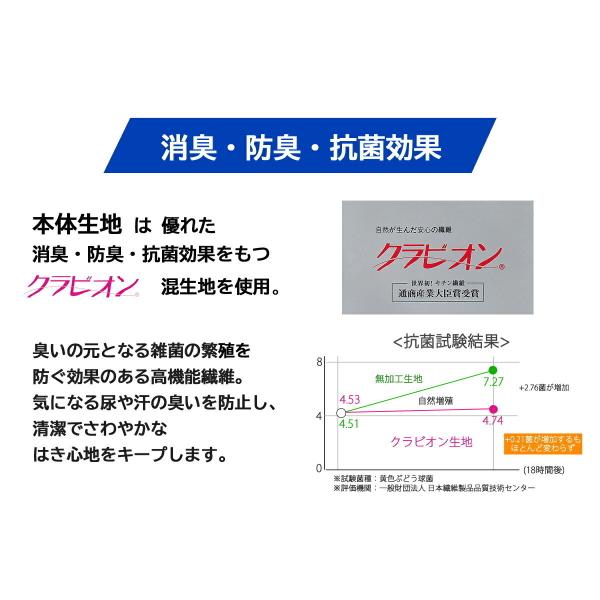 ・本体生地は、抗菌・防臭・消臭作用のあるクラビオン混生地使用で、肌触りがよく快適な履き心地