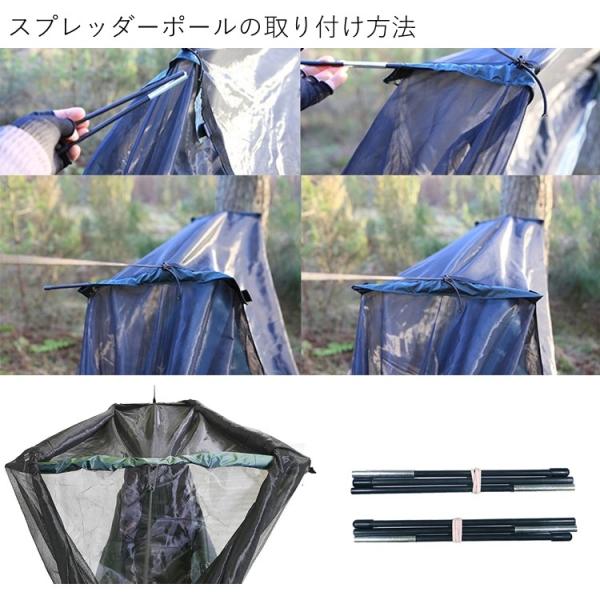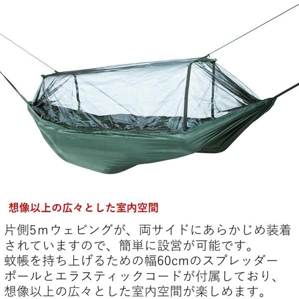 内容品:ハンモック本体(蚊帳付き)、ハンモックウェビング5mx2本 エラスティックコード(2m×2本) ライトウェイトポール2本、スタッフサック