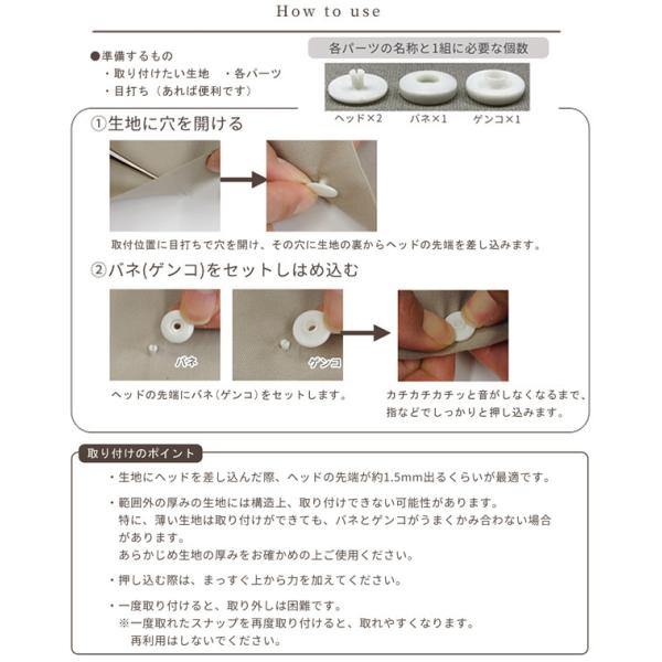 手で簡単にカチッと取り付けできるスナップボタンです。