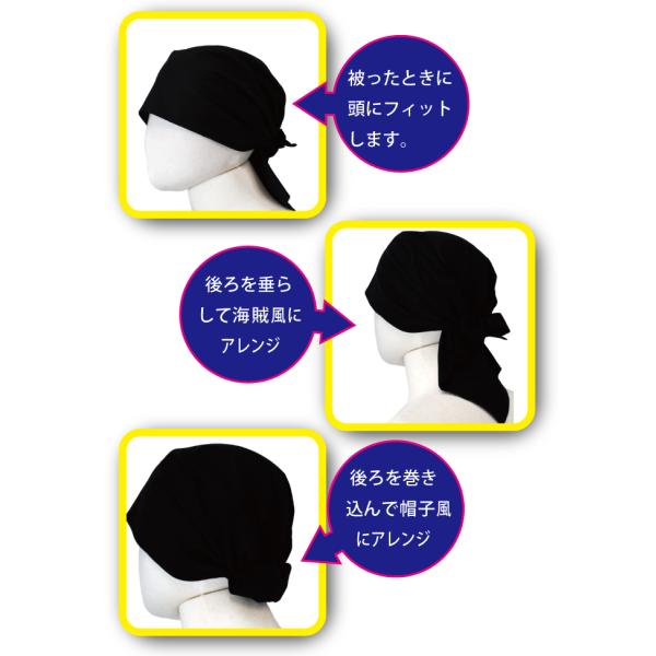 後ろはパイレーツ風に垂らしたり、縛り目に巻き込んで帽子風に着用することもできます。