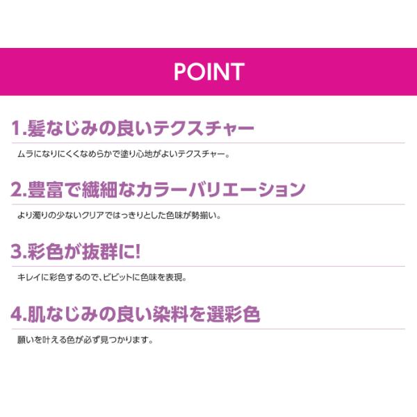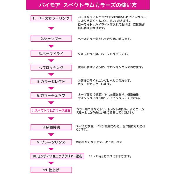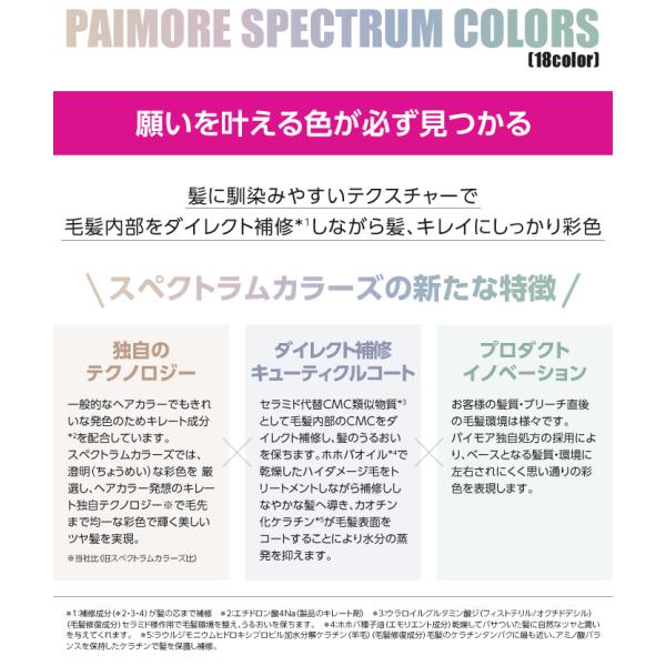 パイモア独自処方の採用によりベースとなる髪質・環境に左右されにくく思い通りの彩色を表現します。