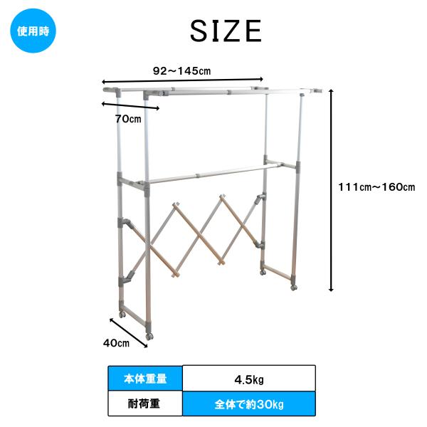 幅92〜145cmの伸縮式専用竿が3本付いていますので、コンパクトなスペースにもたっぷりの洗濯物が干せます。