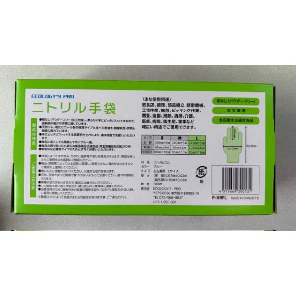 ECOLOGY’S PRO ニトリル手袋 パウダーフリー 食品衛生法適合商品 左右兼用 P-NRFL 「Lサイズ」 ブルー 100枚入 1箱