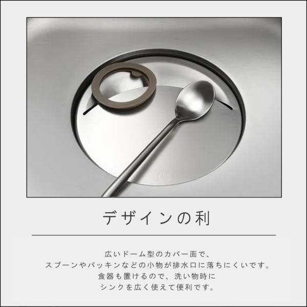 銅イオンの抗菌効果でぬめりを軽減するステンレス製排水口カバー。一般的な菊割れゴムの排水口カバーに比べ、シンプル形状で汚れが溜まりにくく、サッと洗えるのも特徴。