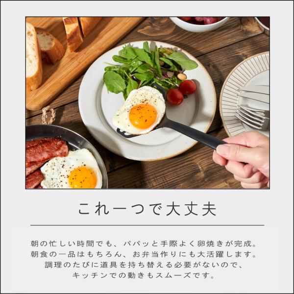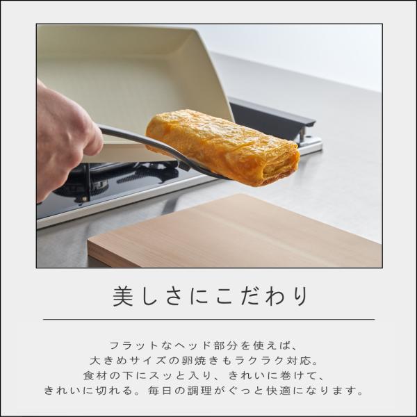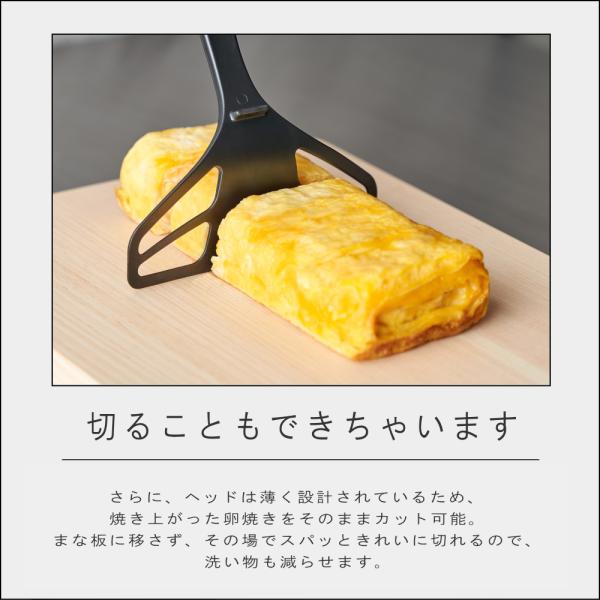 フラットなヘッド部分を使えば、大きめサイズの卵焼きもラクラク対応。食材の下にスッと入り、きれいに巻けて、きれいに切れる。毎日の調理がぐっと快適になります。