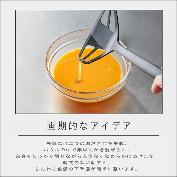 先端には二つの卵溶き穴を搭載。ボウルの中で素早くかき混ぜられ、白身をしっかり切りながらムラなくなめらかに溶けます。時間のない朝でも、ふんわり食感の下準備が簡単に整います。