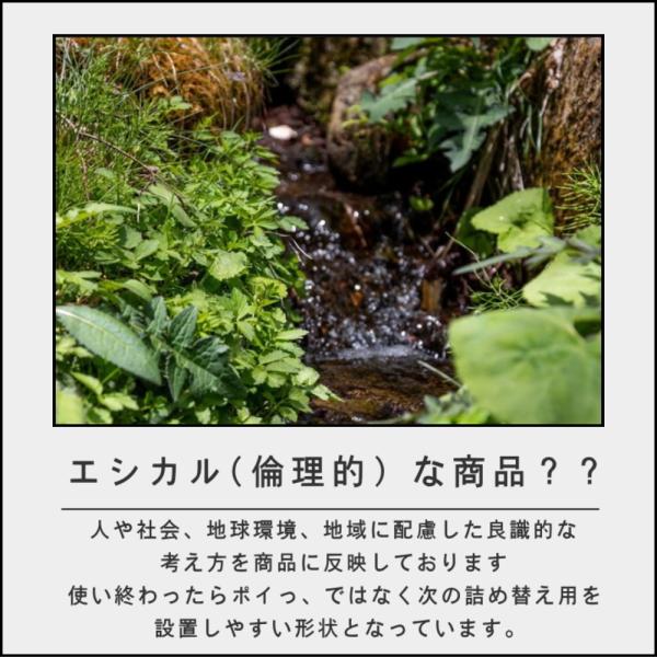 天然由来のエッセンシャルオイルを配合。パッケージもリフィルもそのままスタンドにセットして使う環境に配慮されたエシカルなシリーズ。