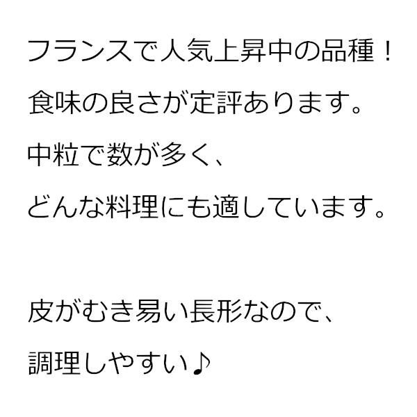 グウェンは、フランスで人気上昇中の品種で、食味の良さが定評あります。中粒で数が多く、どんな料理にも適しています。メークイーンのような長形なので、皮がむきやすく調理しやすい♪