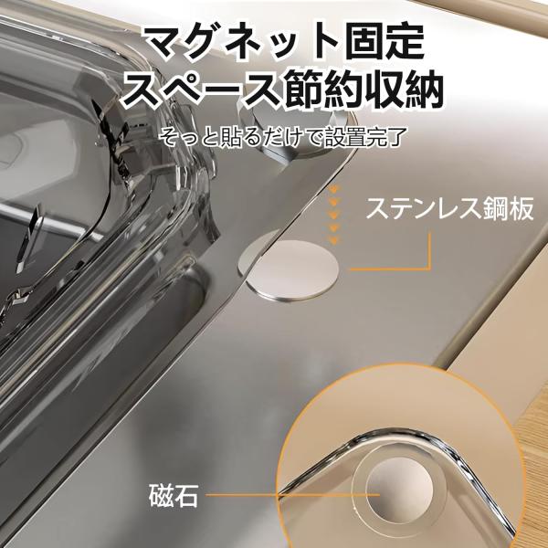 シンクの角にしっかり固定できるマグネット式。従来の吸盤タイプより安定感があり、滑り落ちや傾きを防ぎます。調理中の振動にも強く、省スペースで設置できるため、キッチンスペースを有効活用できます。