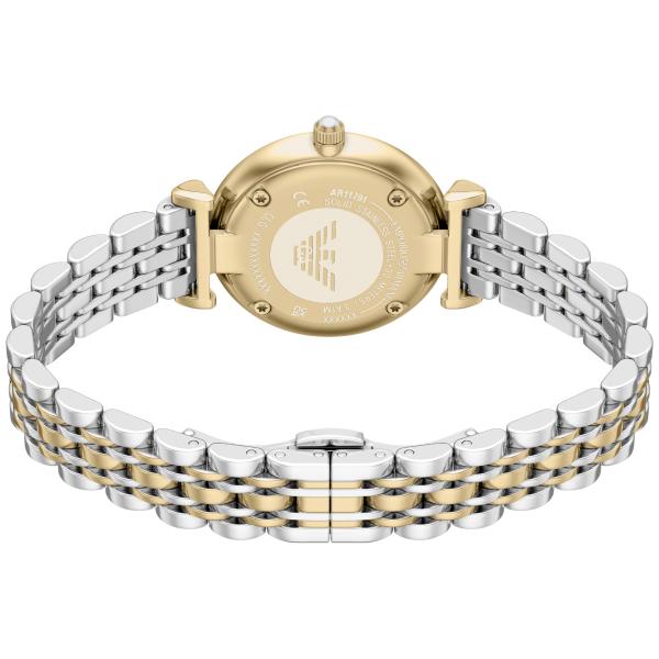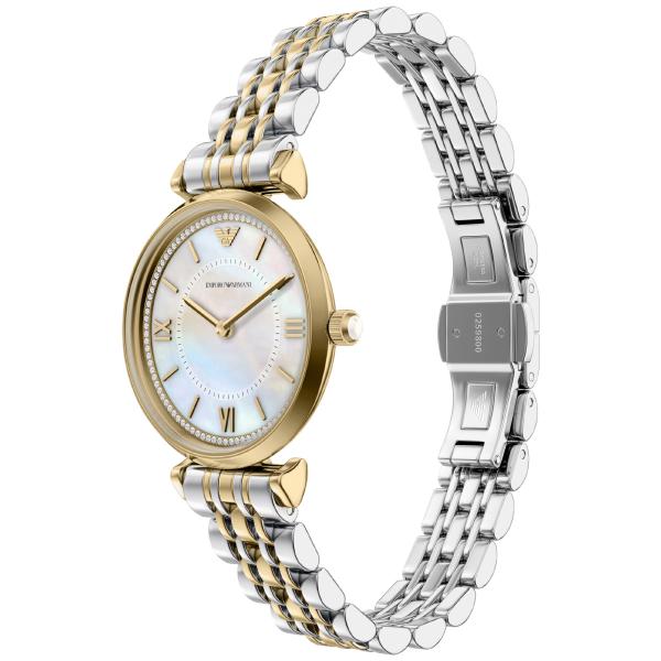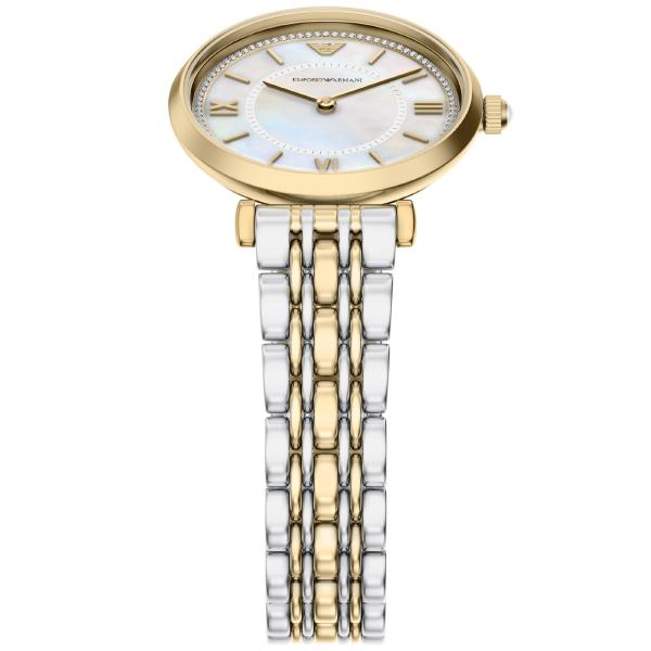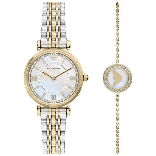 【エンポリオアルマーニ EMPORIO ARMANI 腕時計 レディース ステンレススチール ウォッチ&ブレスレットセット AR80086SET エンポリオ・アルマーニの32mm径ウォッチ。ホワイトマザーオブパールのダイヤルとクリスタルのインレイを施した外縁を組み合わせました。ローマ数字インデックスが、ゴールドトーンステンレススチール製ケースと複雑なツートーンのブレスレットに配されたダイヤルを彩ります。このギフトセットには、可憐なゴールドトーンのジュエリーブレスレットと、マザーオブパールのインレイで囲んだイーグルのロゴチャーム、クリスタルのリングがセットになっています。[エンポリオ アルマーニ EMPORIO ARMANI 2026 新作]】