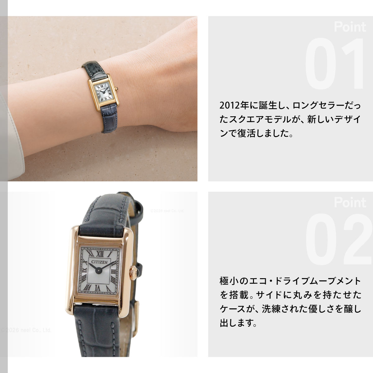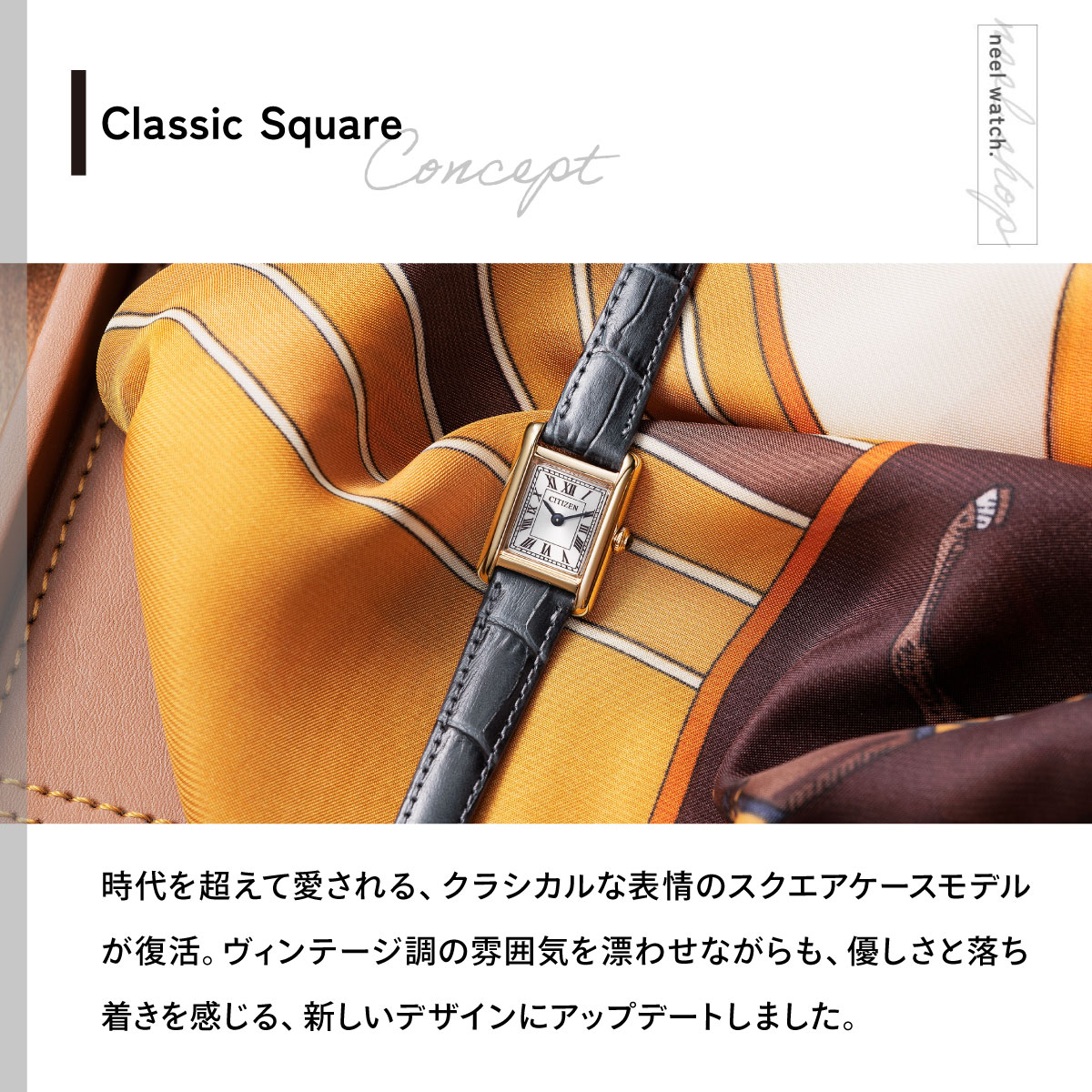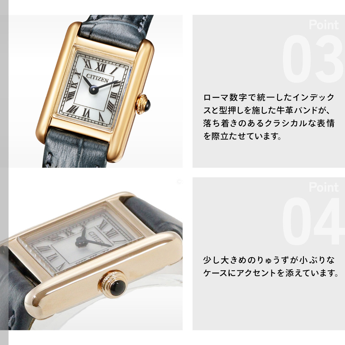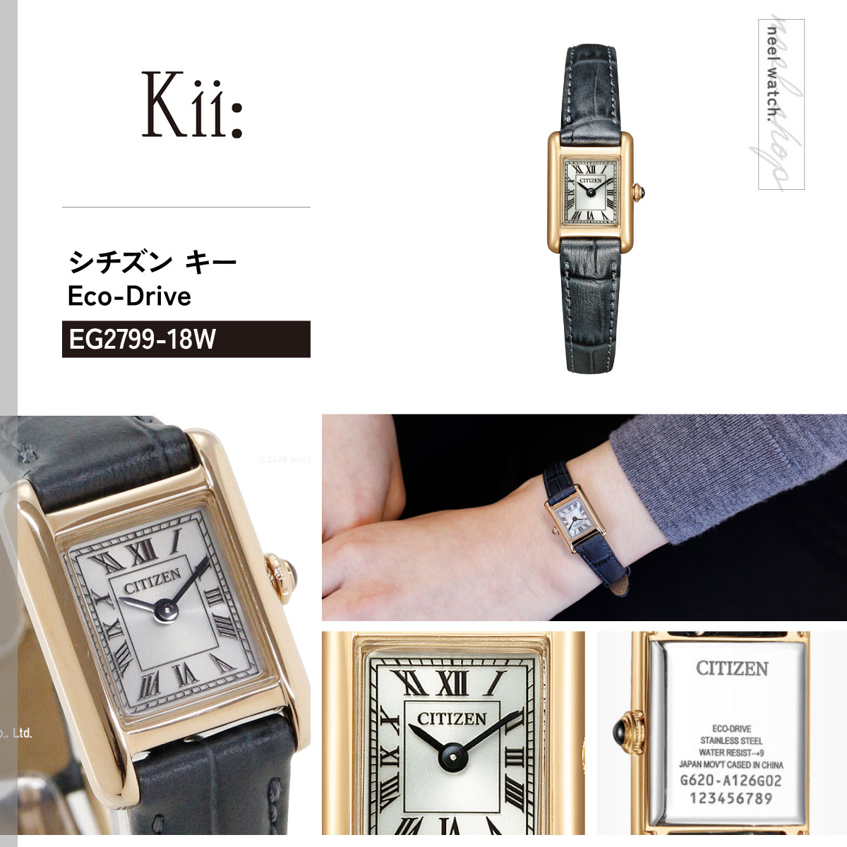 【シチズン キー CITIZEN Kii: エコドライブ ソーラー 腕時計 レディース EG2799-18W Classic Square アンティークデザインのエコ・ドライブアクセサリーウオッチシチズン Kii:(キー)。時代を超えて愛される、クラシカルな表情のスクエアケースモデルが復活。ヴィンテージ調の雰囲気を漂わせながらも、優しさと落ち着きを感じる、新しいデザインにアップデートしました。2012年に誕生し、ロングセラーだったスクエアモデルが、新しいデザインで復活しました。極小のエコ・ドライブムーブメントを搭載。サイドに丸みを持たせたケースが、洗練された優しさを醸し出します。ローマ数字で統一したインデックスと型押しを施した牛革バンドが、落ち着きのあるクラシカルな表情を際立たせています。少し大きめのりゅうずが小ぶりなケースにアクセントを添えています。[シチズン キー CITIZEN Kii: 2026 新作]】