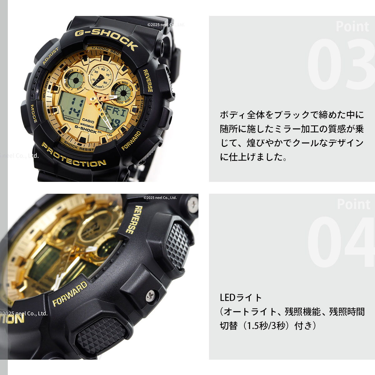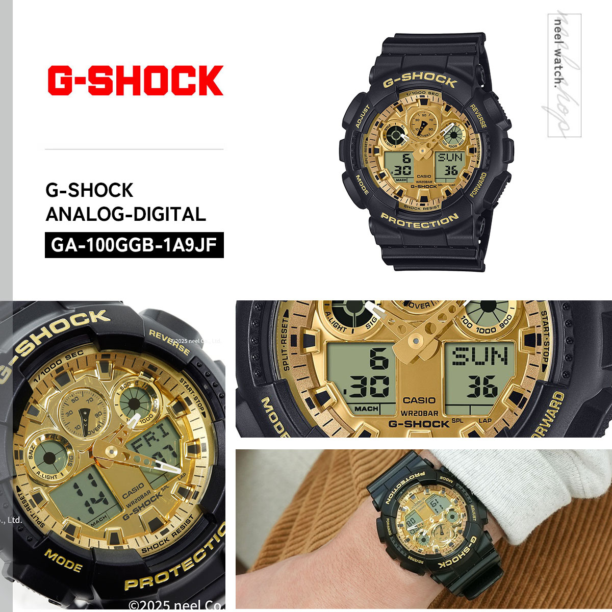 【Gショック G-SHOCK アナデジ 腕時計 メンズ GA-100GGB-1A9JF Black and Gold Series ジーショック タフネスを追求し進化を続けるG-SHOCKから、Black and Gold Seriesのご紹介です。G-SHOCKらしい武骨なオールブラックのボディに、エネルギッシュに輝くゴールドをカラーリングしています。GA-100GGB-1A9JFは、文字板にゴールド蒸着を施し、液晶部にはゴールド液晶を採用し、フェイス部にゴールドを全面的に使用したモデルとなっています。最新のテクノロジーと高いデザイン性を兼ね備えた、G-SHOCKです。[カシオ Gショック CASIO G-SHOCK 2025 新作]】