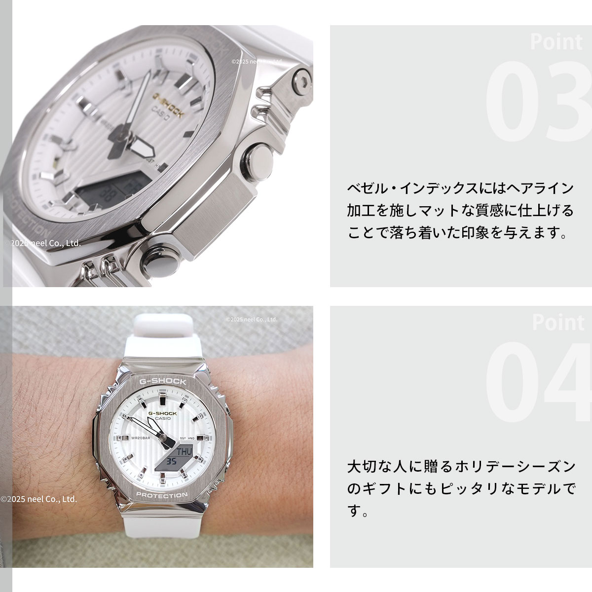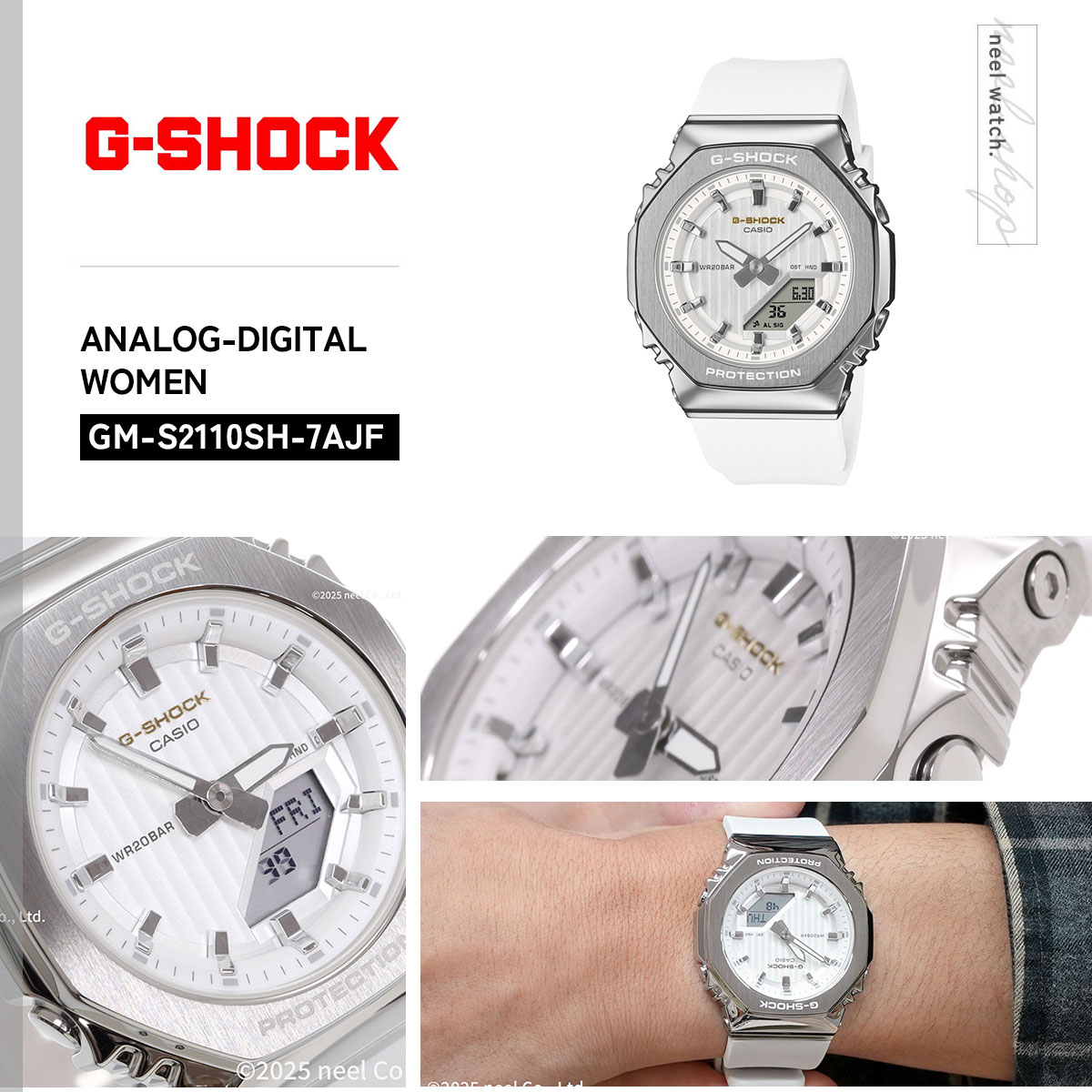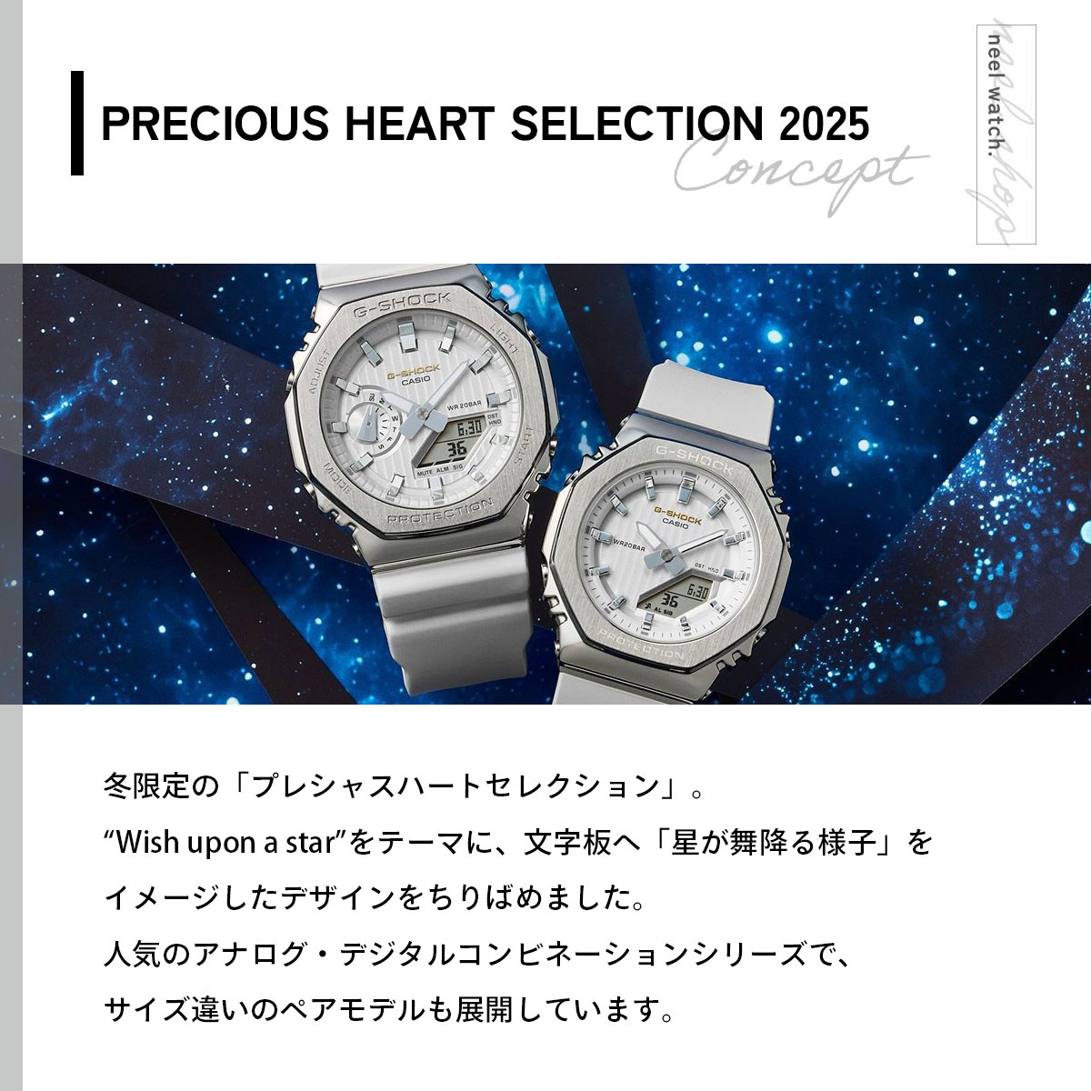 【Gショック G-SHOCK 時計 レディース GM-S2110SH-7AJF プレシャス ハート セレクション 2025年限定 ジーショック 冬限定の「プレシャスハートセレクション2025」。“Wish upon a star”をテーマに、文字板へ「星が舞降る様子」をイメージしたデザインをちりばめた華やかな2025年限定モデルです。ベースモデルは人気のアナログ・デジタルコンビネーションシリーズの2100を採用し、それぞれサイズ違いでペアになるよう展開しています。カラーバリエーションは「ネイビー」「ホワイト」の2色展開で、ネイビーは「夜空」、ホワイトは「流れ星」をイメージしています。文字板のG-SHOCKのロゴのゴールドカラーは星の輝きを、文字板上のストライプパターンは星が降り注ぐ様子を表現しています。GM-2110SH/GM-S2110SHともに文字板にはメタル素材を採用し質感をアップしています。また、ベゼル・インデックスにはヘアライン加工を施しマットな質感に仕上げることで落ち着いた印象を与えます。[カシオ Gショック CASIO G-SHOCK 2025 新作]】