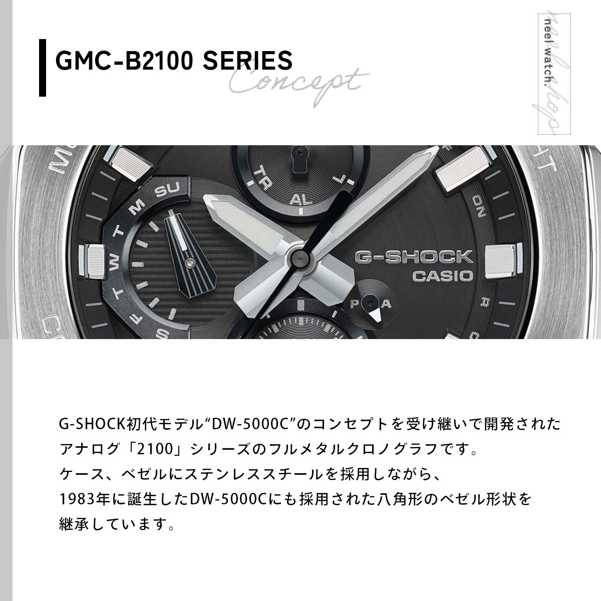 【Gショック G-SHOCK ソーラー 腕時計 メンズ GMC-B2100Y-1AJF ジーショック フルメタル クロノグラフ G-SHOCK初代モデル“DW-5000C”のコンセプトを受け継いで開発されたアナログ「2100」シリーズのフルメタルクロノグラフです。ケース、ベゼルにステンレススチールを採用しながら、1983年に誕生したDW-5000Cにも採用された八角形のベゼル形状を継承しています。ベゼルとケースの間に、ファインレジン製の緩衝材を実装することで、メタル外装による耐衝撃構造を可能にしています。ベゼルは、手間のかかる鍛造・切削・研磨加工を経て、立体的に成形し、天面を円周状のヘアライン、斜面をミラー研磨で美しく仕上げています。インデックスやインダイアルリングには微細加工技術による繊細な造形と、蒸着加工を施すことで高い質感に仕上げました。[カシオ Gショック CASIO G-SHOCK 2025 新作]】