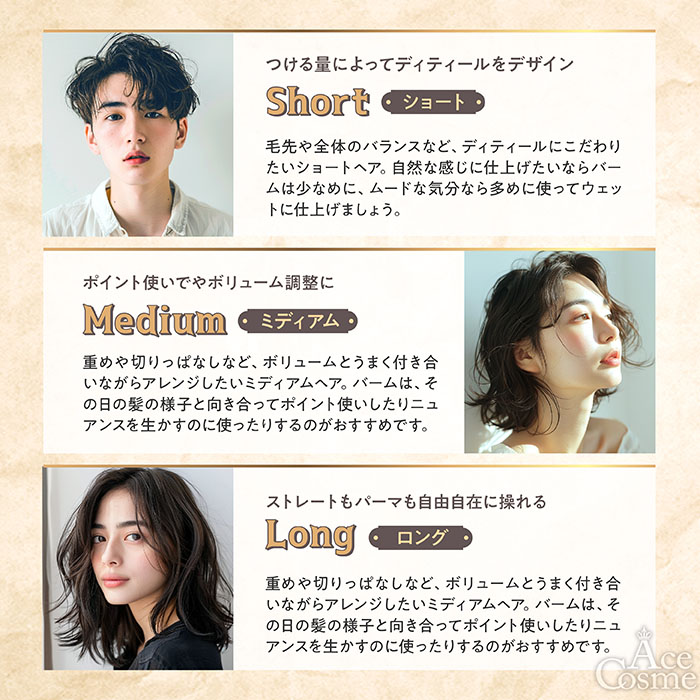 適量を手のひらの温度で温めると伸びがよくなり、髪のボリュームアップ・ダウンやまとめ髪など様々な用途でお使いいただけます。