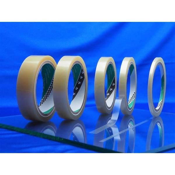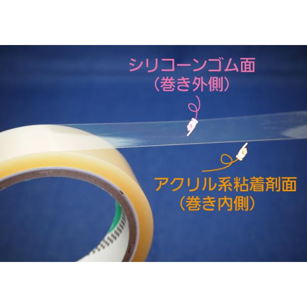 透明のポリエステルフィルムを基材として、片面に密着性(ぬれ性)に優れたシリコーンゴム層、もう一方には強接着タイプのアクリル系粘着剤が塗布された粘着テープです。