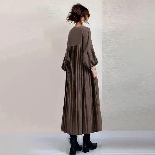 プリーツワンピース 長袖 レディース 秋服 パフスリーブ 丸首 ロングワンピース お呼ばれワンピース 大人きれいめエレガント リゾート 黒 ブラック 着回し40代