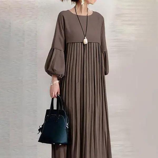プリーツワンピース 長袖 レディース パフスリーブ 丸首 ロング