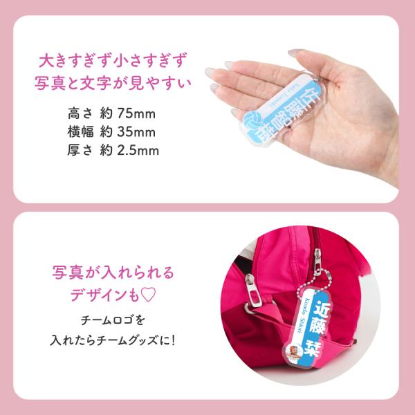 サイズはちょうどいい 75mm×35mm×2.5mm で、文字や写真が見やすく、おしゃれなデザイン。スポーツや文化部など、さまざまな部活動に対応!自分用はもちろん、チームメンバーやコーチへのプレゼントにも最適です