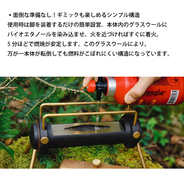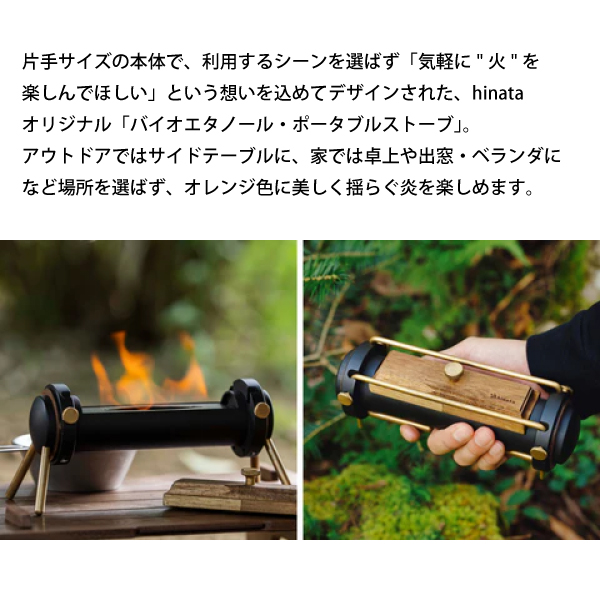 片手サイズの本体で、利用するシーンを選ばず「気軽に”火”を楽しんでほしい」という想いを込めてデザインされた、hinataオリジナル「バイオエタノール・ポータブルストーブ」。