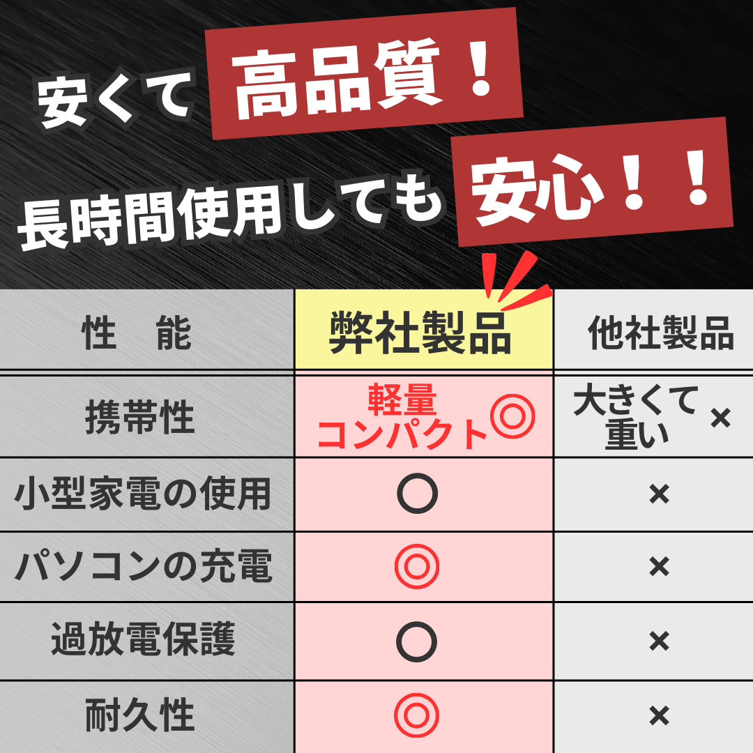 ◆安心な設計:過放電保護 過熱保護 過電流保護 等、安心して毎日使用できる設計です。