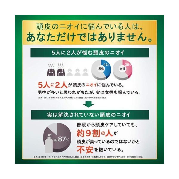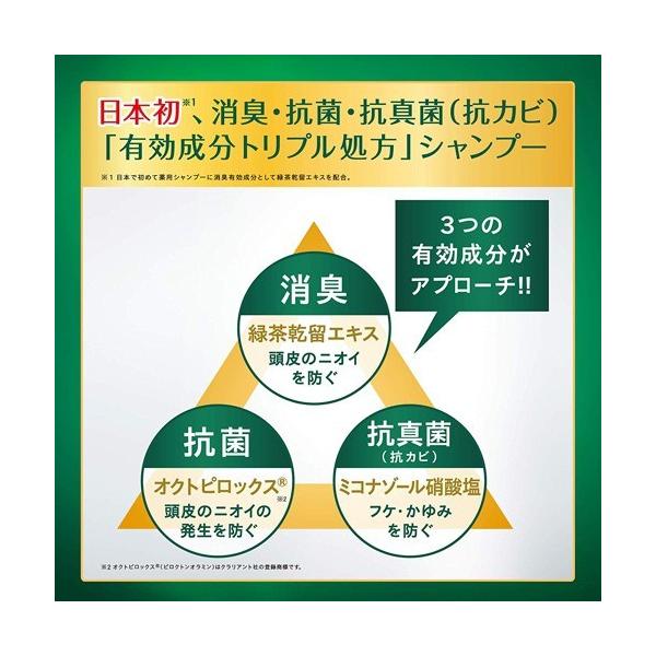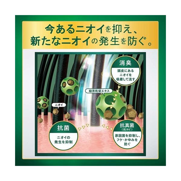 ◆「緑茶乾留エキス」が、毛髪・頭皮の今あるニオイを包み込んで抑えます。また、「オクトピロックス」が菌の増殖や皮脂の酸化を抑制し、頭皮のニオイの発生を防ぎます。さらに、「ミコナゾール硝酸塩」がフケ原因菌の増殖を抑制し、フケ・かゆみを防ぎます。