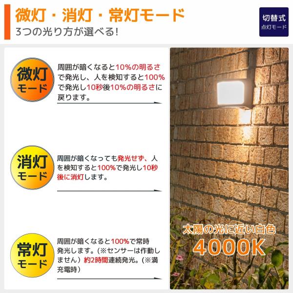 【3つの点灯モード】状況や設置場所に応じて選べる、3つの点灯モード搭載しています。ボタンひとつで簡単に切り替え操作が可能で、赤色インジケーターの点滅回数によって現在の点灯モードを確認できる「点灯モードお知らせ機能」も備えています。