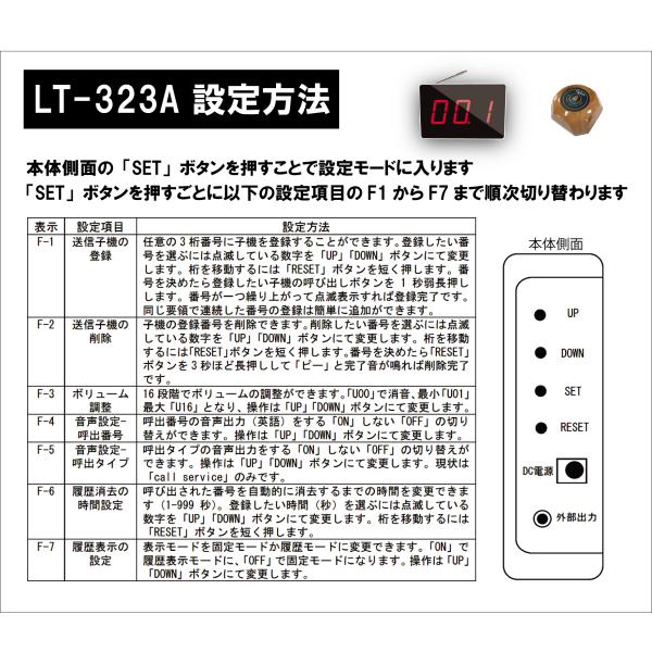 ・付属品:受信本体:LT-323A、ACアダプター、送信子機:LT-037T(5台)、固定金具