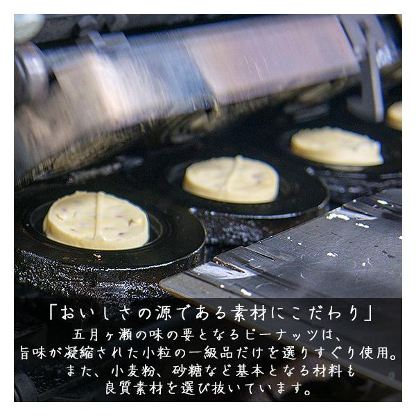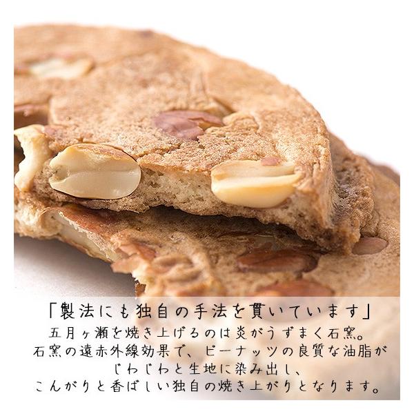 おもてなしの心が育んだ福井を代表するお菓子。石窯を使って一枚一枚焼型でじっくりと焼き上げ、材料の風味を生かしまろやかな風味と香ばしさを醸し出しています。煎餅と落花生の美味しさのハーモニーをお楽しみ下さい。五月ヶ瀬煎餅を焼き上げるのは炎がうずまく石窯。石窯の遠赤外線効果でピーナッツの良質な油脂がじわじわと生地に染み出し、こんがりと香ばしい独特の焼き上がりとなります。五月ヶ瀬煎餅の味の要となるピーナッツは旨味が凝縮された小粒の一級品だけをえりすぐって使用。小麦粉、砂糖、マーガリンなど基本となる材料も良質素材を選び抜いています。