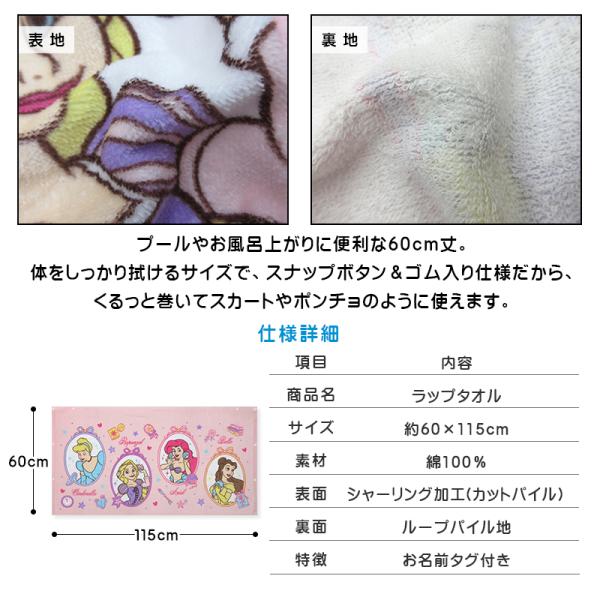 メール便送料無料 ディズニープリンセス ラップタオル 60cm丈 綿100% ゴム入りギャザー ホック付き キャラクター ラプンツェル アリエル アナと雪の女王 rp6