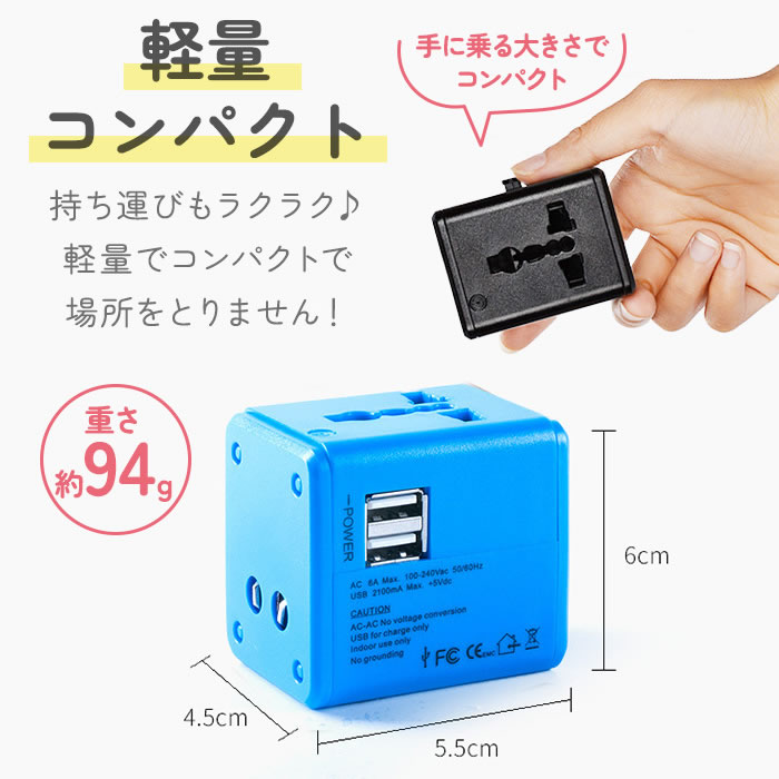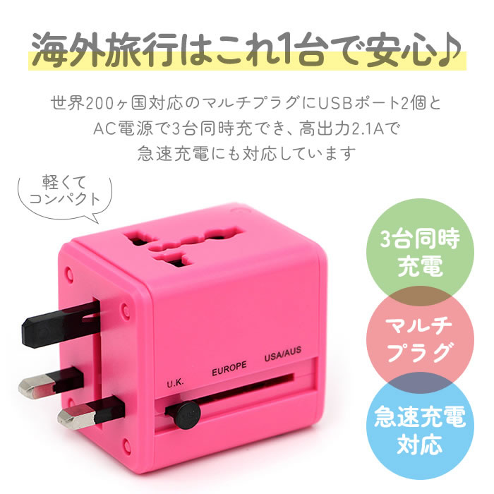 世界200ヶ国以上に対応する海外用マルチプラグ。これ1台で5タイプのコンセントに対応する海外用のプラグです。最大2.1Aと急速充電にも対応。USBポート2口とAC電源で3台同時充電可能。
