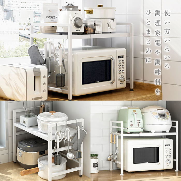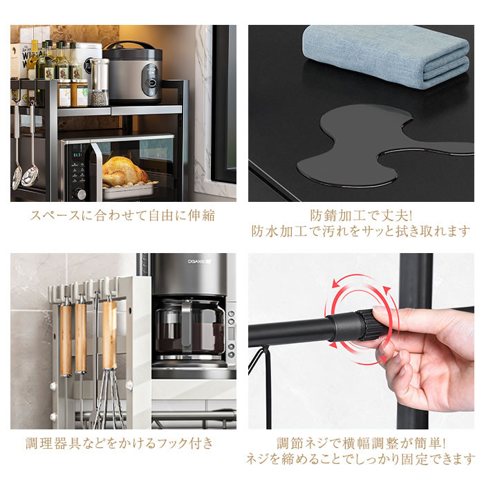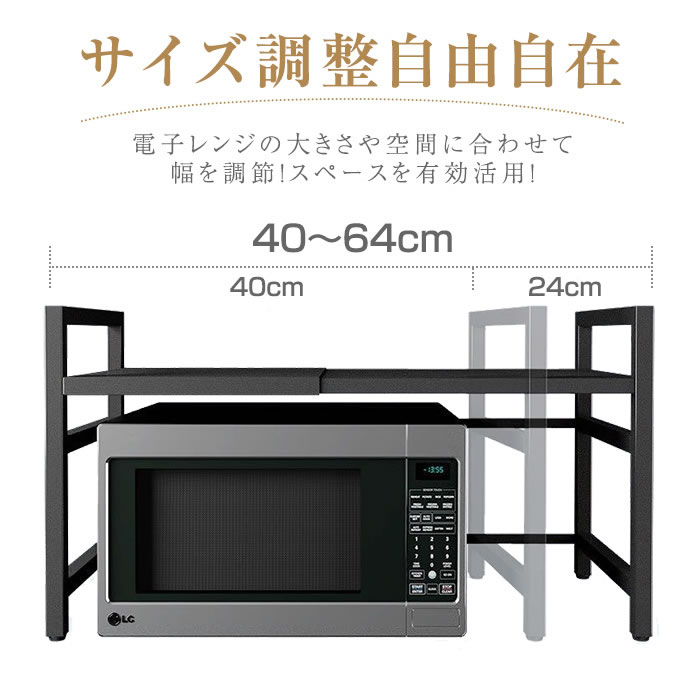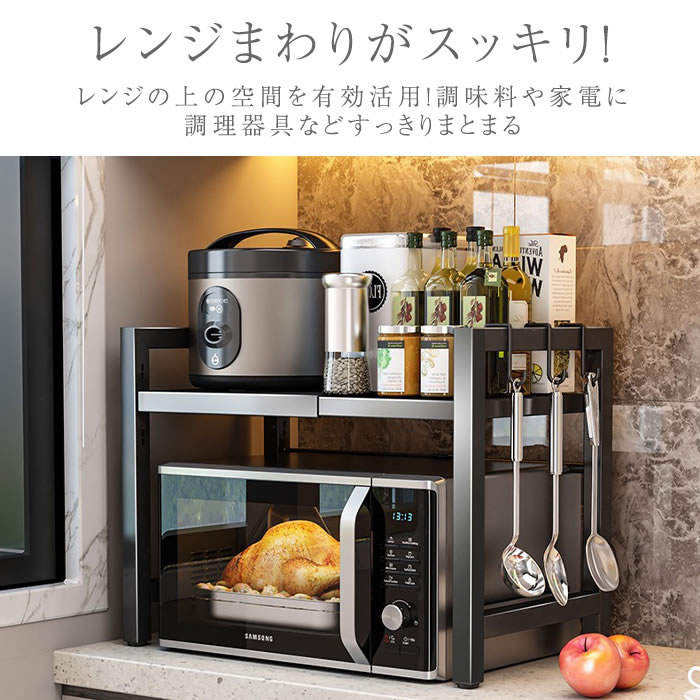 電子レンジまわりがスッキリまとまる伸縮式レンジラック!電子レンジの上のデッドスペースを有効活用!横幅を40〜64cm無段階調整、高さは2段階で調整可能!設置スペースや電子レンジに合わせて横幅・高さをサイズ調整できます。耐荷重も高くトースターや炊飯器などの家電を乗せても安心。鍋つかみや調理器具などを吊るすフック付き。