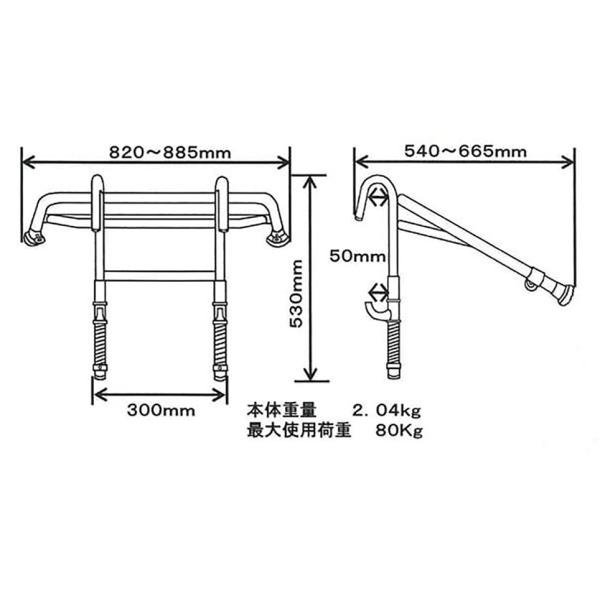 ・ステップ間隔(外寸:ステップ上段の上面から下段の下面まで)が25cm~35cm以内の一連、二連、三連ハシゴにメーカーを問わず取り付け可能(※ただし、ステップ部に補強がある物については、取り付かない可能性があります。また、ハシゴ兼用脚立には使用できません。)