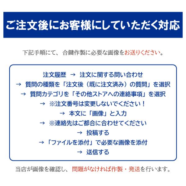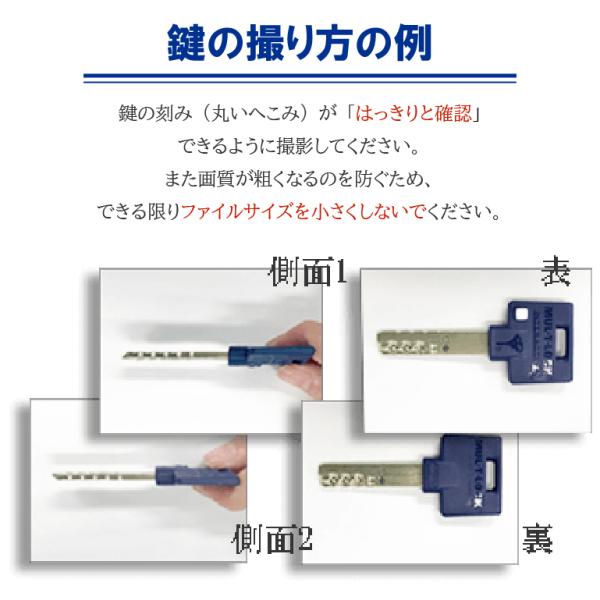 鍵の刻みがはっきりと確認できる「表面」「裏面」「両側面」の計4枚の画像が必要です。