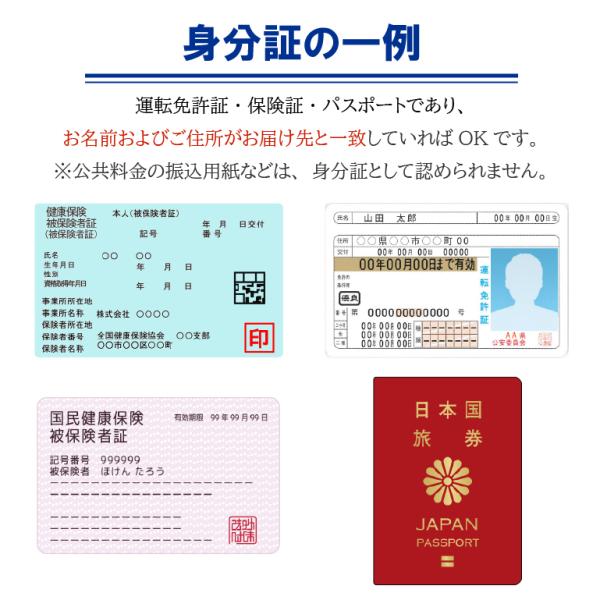 お届け先と一致している「運転免許証」「保険証」などが有効です。