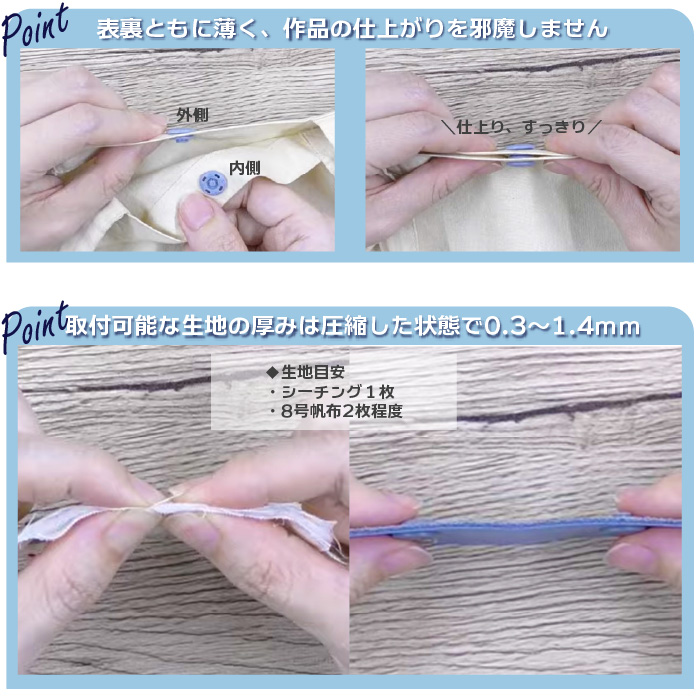 ■バネ(凹側)とゲンコ(凸側)は穴付きで、縫い付けでも使用可能(※縫い付けの場合はヘッドなしで取り付けます)