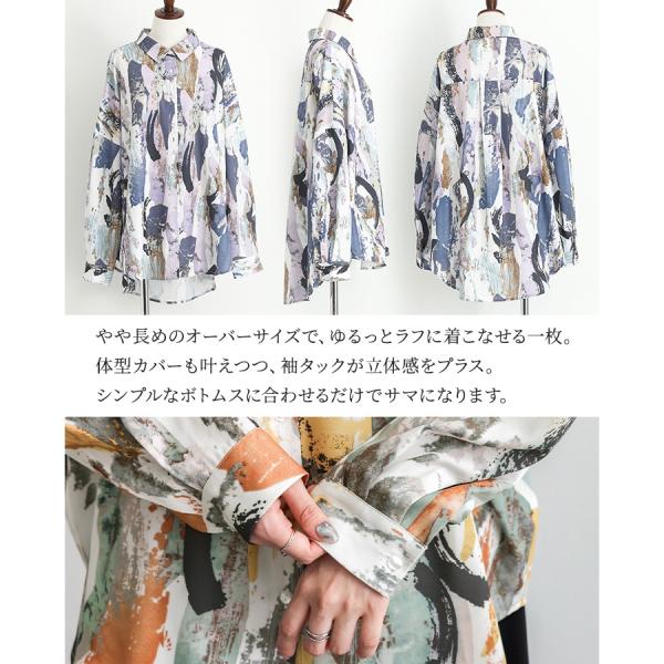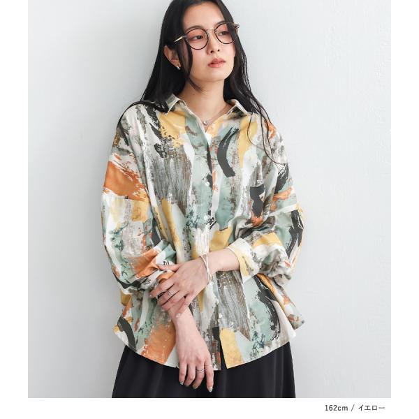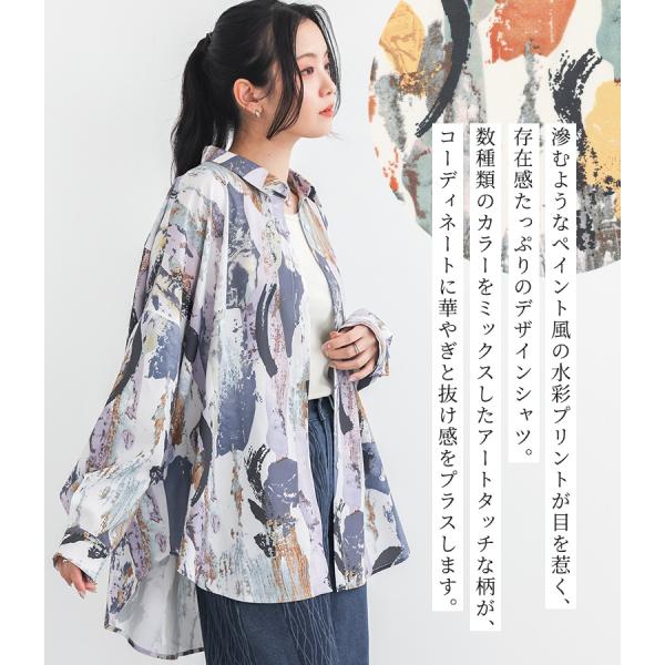 シャツ 長袖 レディース トップス ブラウス 柄シャツ オーバーシャツ 羽織 水彩プリント ペイント風 オーバーサイズ ゆったり 50代 春 秋「メール便可」「10」