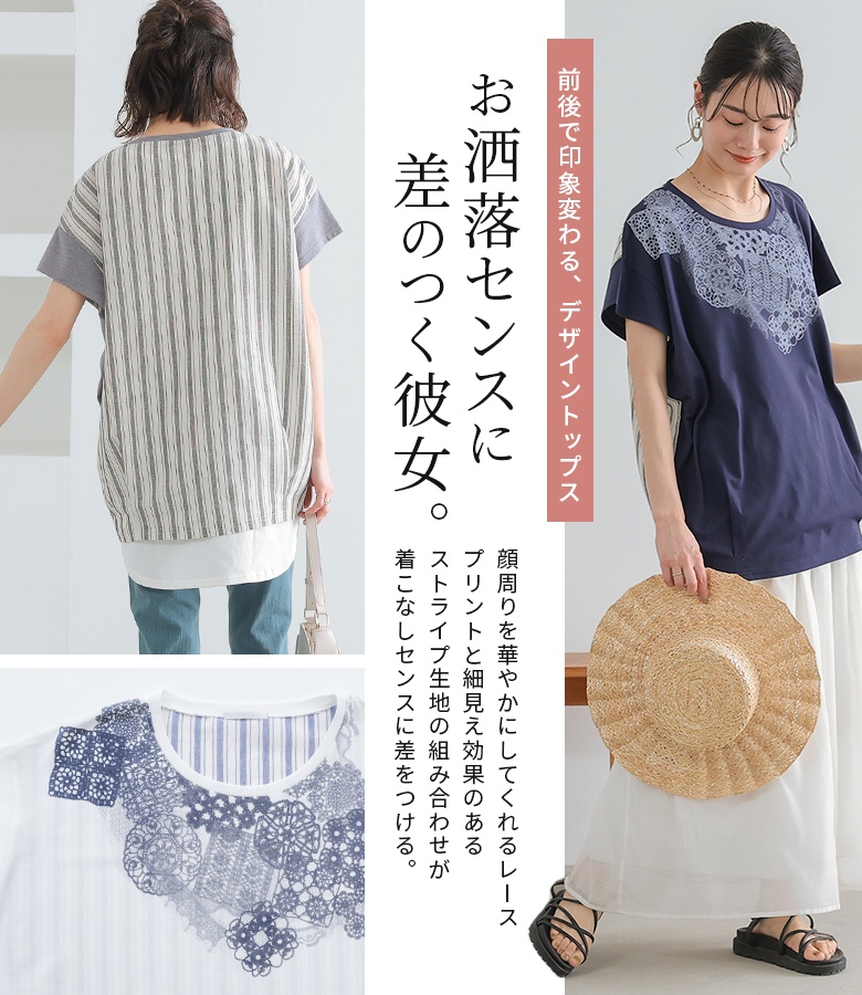 レディース トップス Tシャツ カットソー 半袖 五分袖 ストライプ プリント カジュアル 大人女子 大人可愛い Sサイズ Mサイズ Lサイズ フリーサイズ ホワイト 白 ブルー 青 紺 ネイビー ピンク グレイッシュピンク グレー 灰色 チャコールグレー ぽっちゃり 体型カバー 大きいサイズ おうちで洗える チュニック プルオーバー クルーネック Uネック ミディ丈 ミドル丈 チュニック丈 ストライプ柄 総柄 配色 無地 レイヤード 重ね着 春 夏 シンプル ナチュラル キレカジ フェミニン お洒落可愛い 上品 きれいめ ヴィンテージ レトロ クラシック モード トラッド ニュアンス ラフ エフォートレス LLサイズ 3Lサイズ 4Lサイズ 5Lサイズ XLサイズ 10代 20代 30代 40代 50代 60代 n'OrLABEL ノア―ルレーベル osharewalker オシャレウォーカー 女子会 通勤 通学 お買い物 お出掛け 旅行 リゾート レジャー オフホワイト チャコール[ID]16274027_tay1171[レースプリント×ストライプTシャツ]