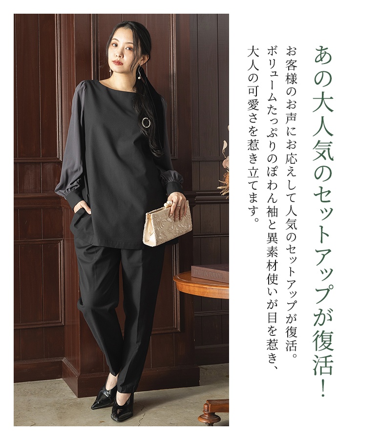 セットアップ レディース トップス 長袖 ぽわん袖 ボートネック 配色 ボトムス テーパードパンツ ロング丈 オケージョン 上下セット ロンT チュニック ブラウス プルオーバー パンツ ロングパンツ スラックス ストレートパンツ ミディ丈 ミドル丈 チュニック丈 フルレングス 10分丈 ギャザー タック ベルトループ 切り替え 無地 異素材 ポケット おうちで洗える 裏地付き フォーマル カジュアル シンプル ナチュラル モード キレカジ フェミニン オフィス・ビジネス Sサイズ Mサイズ Lサイズ LLサイズ 3Lサイズ フリーサイズ ぽっちゃり 体型カバー 大きいサイズ 10代 20代 30代 40代 50代 60代 n'OrLABEL ノア―ルレーベル 大人女子 大人可愛い お洒落可愛い 大人カジュアル ベーシック ニュアンス ラフ エフォートレス オフィスカジュアル 女子会 オフィス 通勤 通学 お買い物 お出掛け 旅行 パーティー 二次会 結婚式 セレモニー 謝恩会 入園式 入学式 卒園式 卒業式 学校行事 お宮参り 七五三 ママ 母 母親 ママスーツ グレー 灰色 ライトグレー ブラック 黒 oshareoc15[ID]pln0014[n'OrLABEL異素材ブラウスセットアップ]