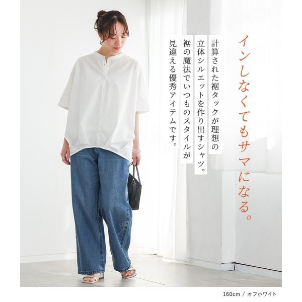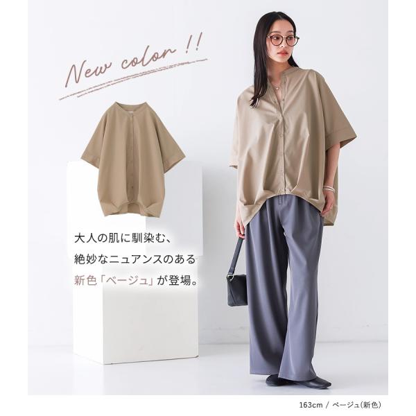 レディース トップス ブラウス シャツ ボタンシャツ 前開きシャツ バンドカラー 立ち襟 半袖 五分袖 ドルマンスリーブ 折り返し袖 ドロップショルダー 変形 ドレープ 裾タック 後ろ下がり ストライプ柄 配色 無地 イレギュラーヘム ラウンドヘム おうちで洗える 春夏 女子会 カジュアル お出掛け 旅行 通勤 通学 お買い物 大人女子 大人可愛い お洒落可愛い 上品 きれいめ モード シンプル ナチュラル ニュアンス ラフ Sサイズ Mサイズ Lサイズ LLサイズ 3Lサイズ XLサイズ フリーサイズ ぽっちゃり 体型カバー 大きいサイズ n'OrLABEL ノア―ルレーベル ホワイト 白 紺 ネイビー ライトグリーン 緑 スモーキーミント ブラック 黒 バイカラー くすみカラー スモーキーカラー 【トップス】 fs0601 ベージュ[ID]thn0338[n'OrLABELバンドカラー裾タックシャツ]