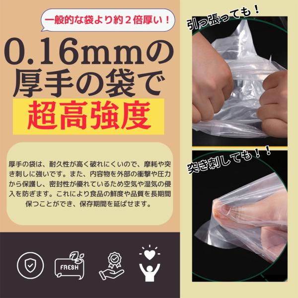 冷凍保存用に適した丈夫な0.16mm厚(片側は0.08mm)の袋です。