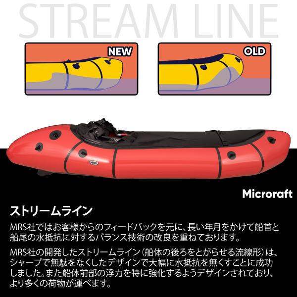 マイクロラフトの特徴は取外し可能なスプレーデッキで色んなシーンに対応できるマルチタイプ。静水域でも急流でもどちらでも兼用できるので、パックラフト購入が初めてでまだ利用目的がはっきりされていない場合の第一艇としてもお勧めです。MRSのパックラフトは全て一気室で作られています。パックラフトでの自転車旅をお考えの方等、他社メーカーの二気室の商品もご検討ください。