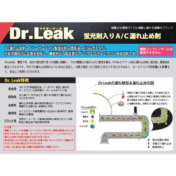 「Dr.Leak」とはA/C漏れ止め剤、蛍光剤、潤滑油、134aガス入り、「機能的」かつ「高品質」なプレミアム品です。